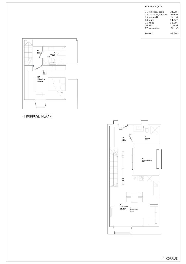 Korter on läbi kahe korruse. Pool keldrikorrusel on punasest tellisest võlvlaed. Seal on kaks magamistuba ja dušširuum-wc. Esimesel korrusel on suur avatud höögiga elutuba, kabinet ja dušširuum-wc. Korteril on oma ventilatsiooni agregaat. Alumisel korrusel on kaugkütte pealt põrandaküte ja ülemisel korrusel on radiaatorid.